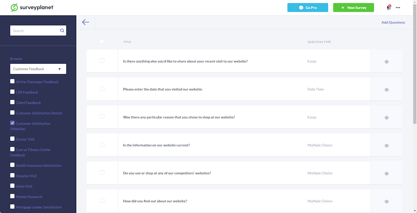 Know yous need to create a survey, simply non sure how to get started? SurveyPlanet is an first-class place to start. It offers over 90 survey templates with pre-written questions that you can use every bit-is or tweak to better fit your needs.